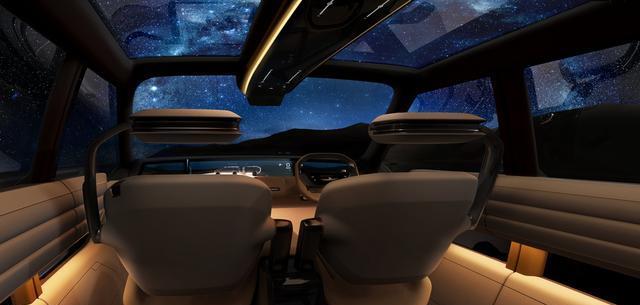 概念车外观采用"豪华探险"设计理念,流畅的座舱轮廓与坚固的下车身形成视觉对比,前脸延续动态护盾设计语言,蜂窝格栅与贯穿式灯组融为一体。侧窗下沿降低的设计增强旅途观景体验,车内配备横贯式透明引擎盖显示屏,可消除前方视野盲区。
