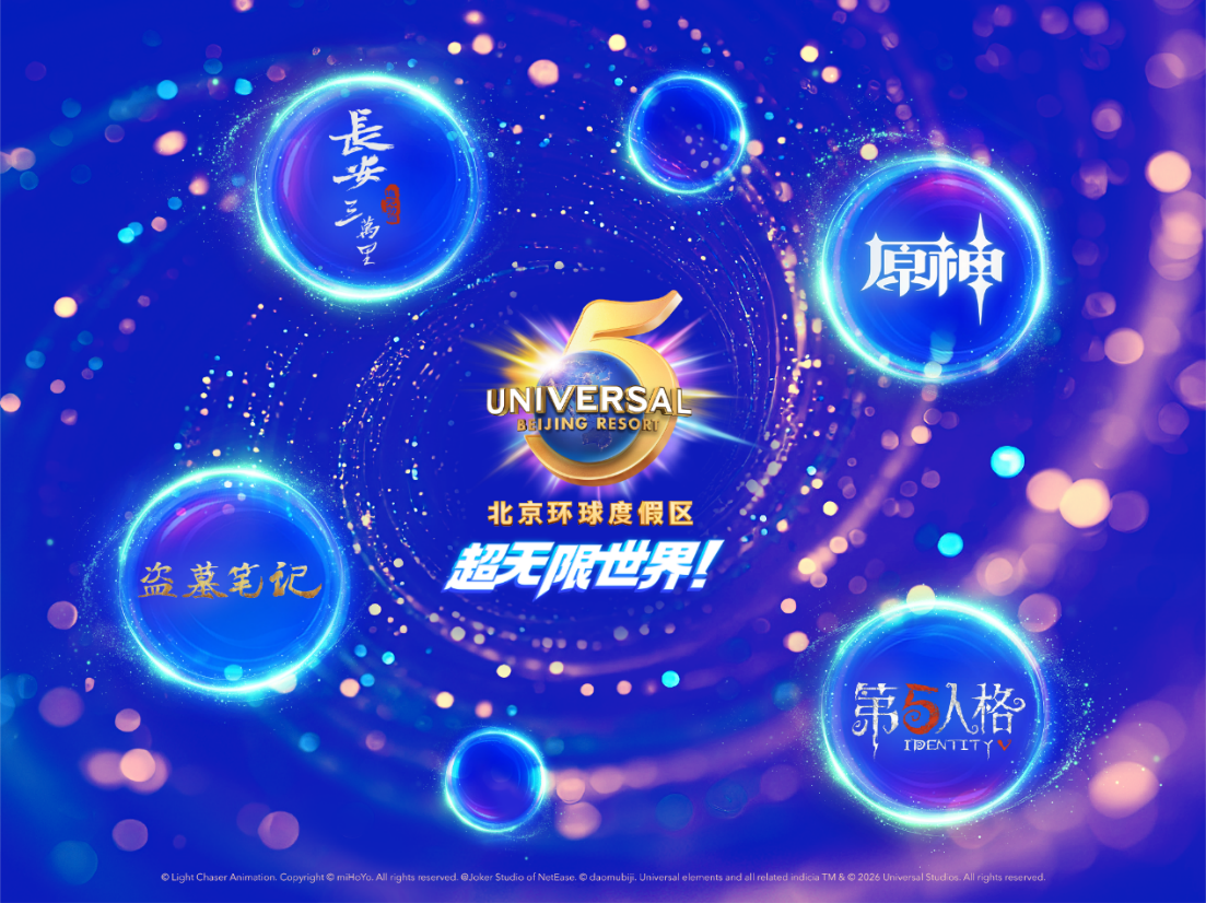 2月4日,北京环球度假区宣布,长安三万里、原神、盗墓笔记、第五人格等多个全球高人气 IP,将分别加入2026年北京环球度假区“环球无限春日”和“惊彩”环球主题性季节活动。