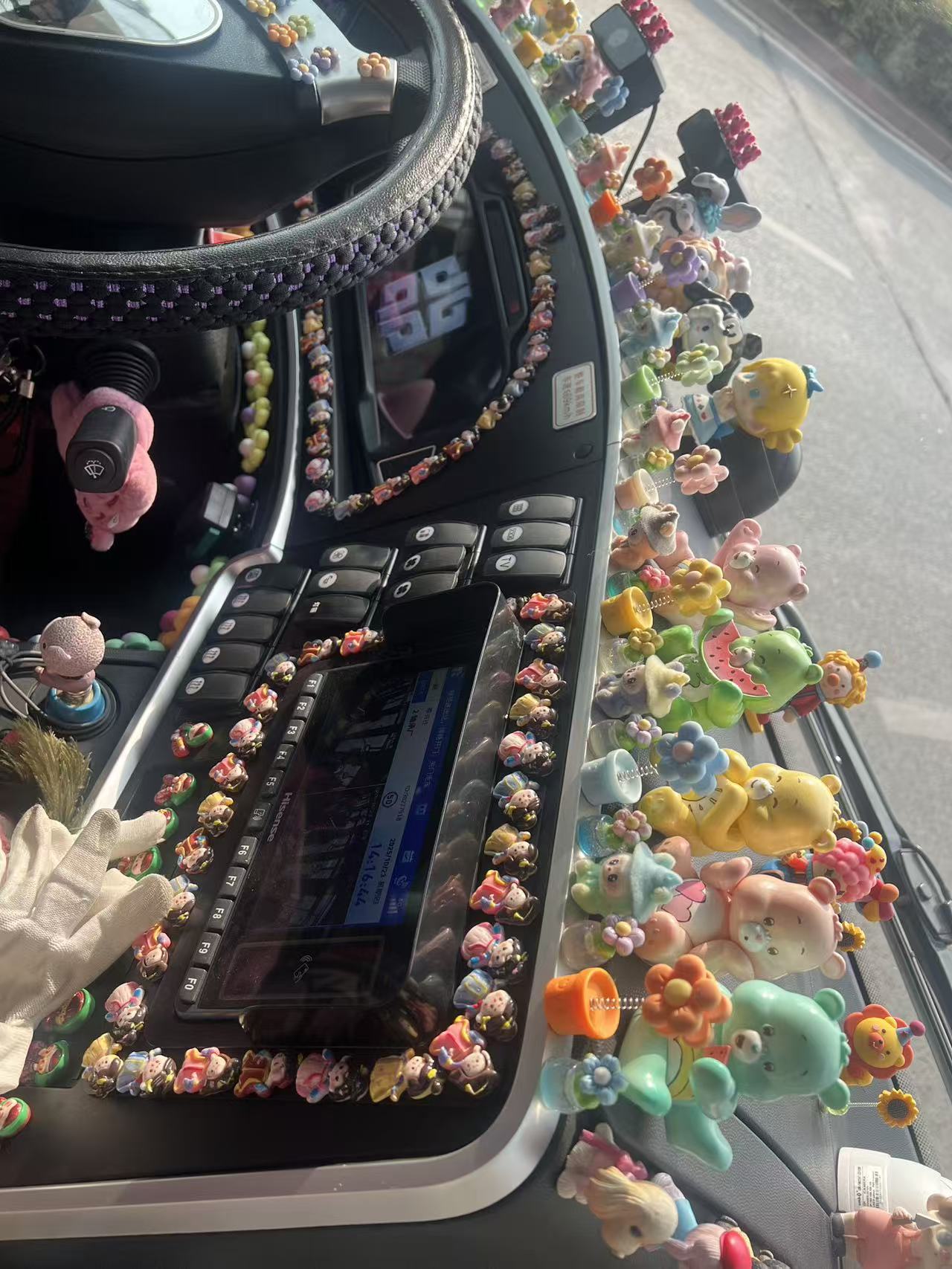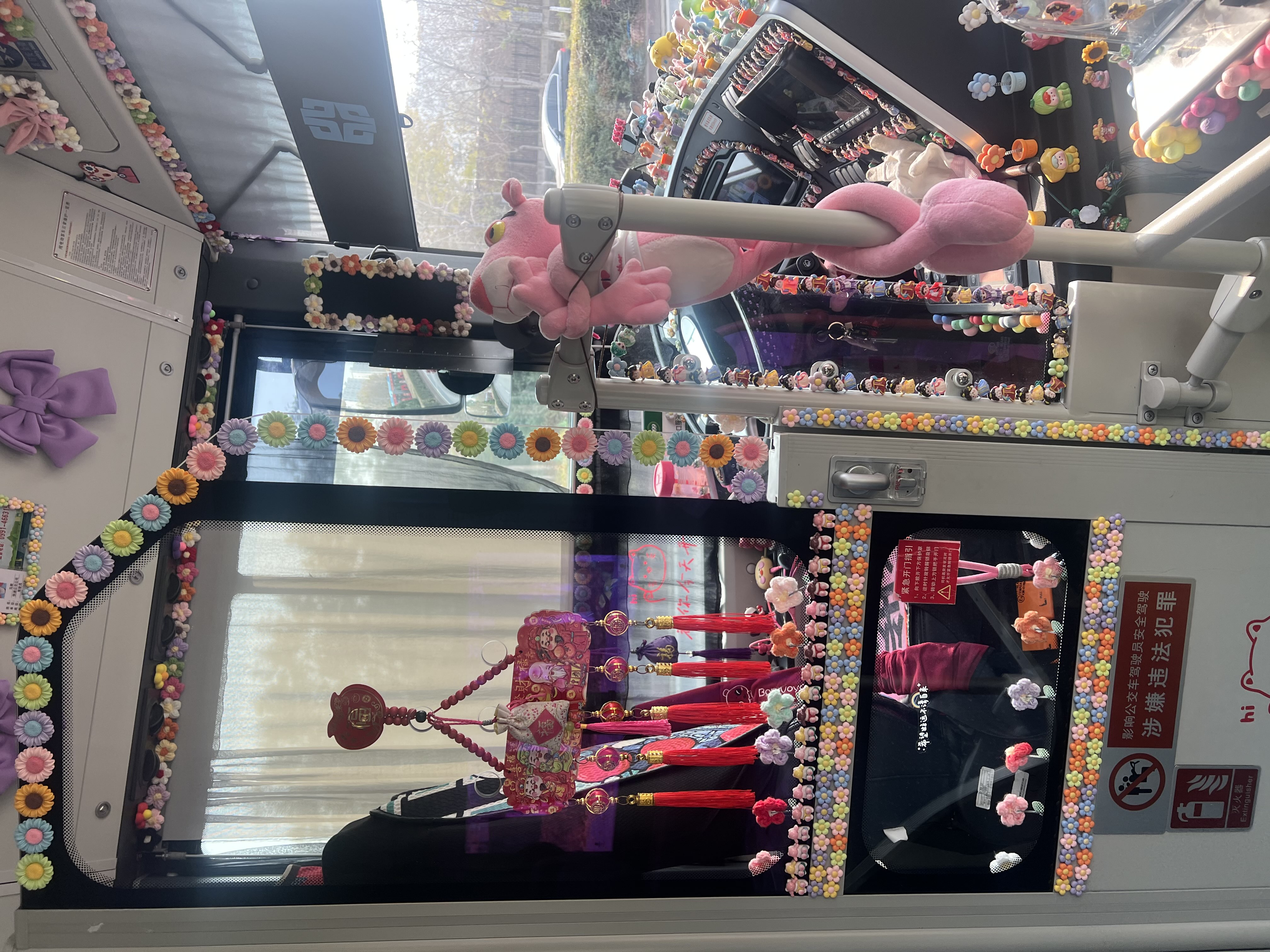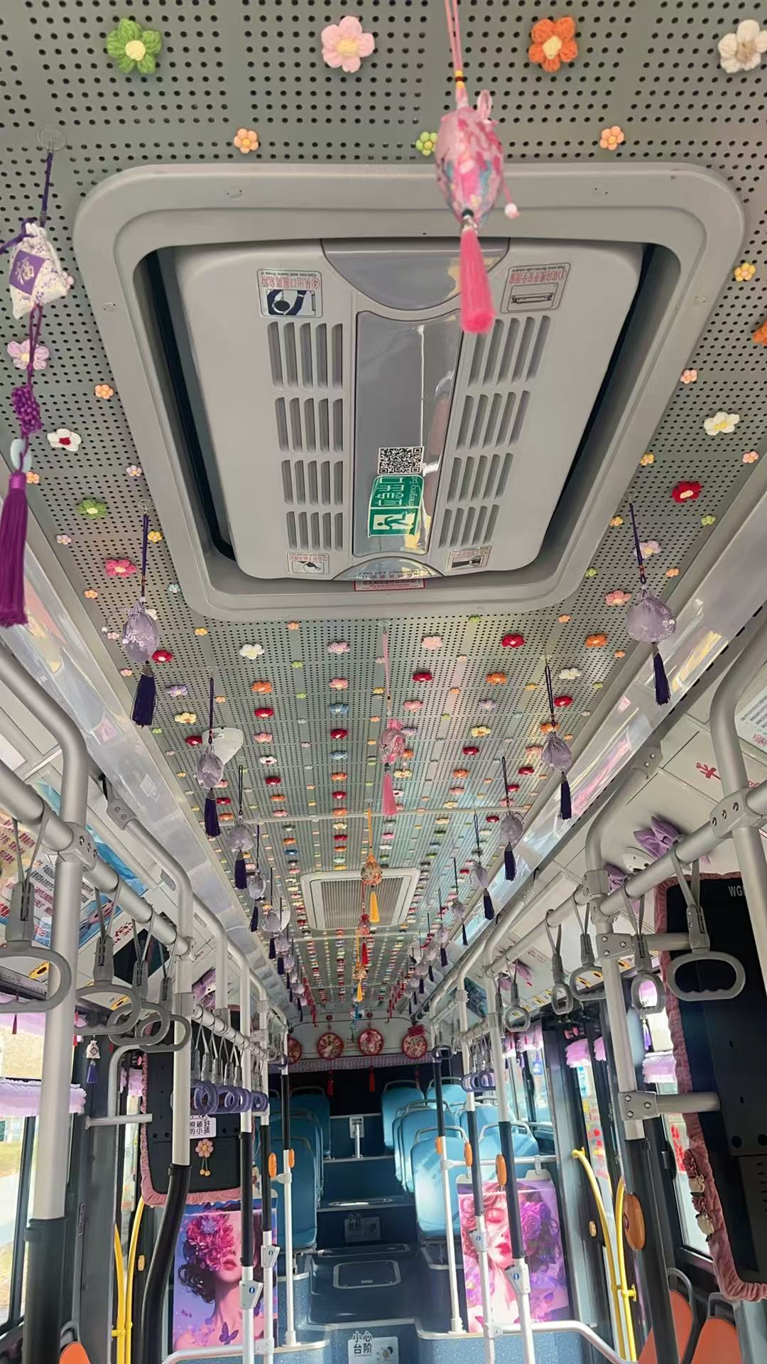 在新疆乌鲁木齐BRT4号线上,一辆公交车格外引人注目——驾驶室前,近百个软萌娃娃挤挨在一起;一抬头,车顶贴满的五彩小花便映入眼帘;转头看向车厢,香包与中国结相映成趣,各式卡通贴纸点缀在车窗边角。