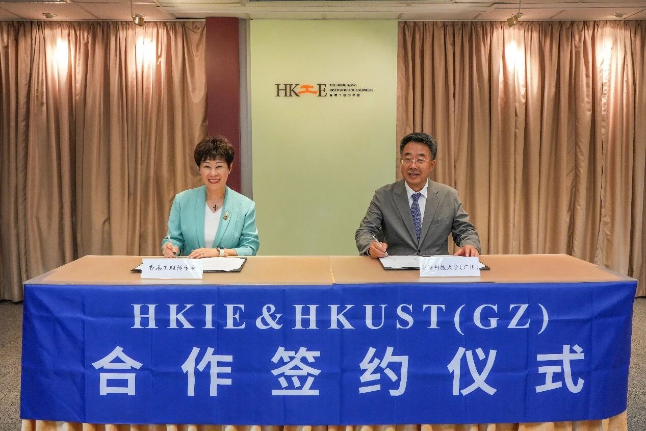 签约仪式上,香港工程师学会会长周健德与港科大(广州)首席工程师、卓越工程中心主任苏权科(代表倪明选校长)在合作备忘录上签字。